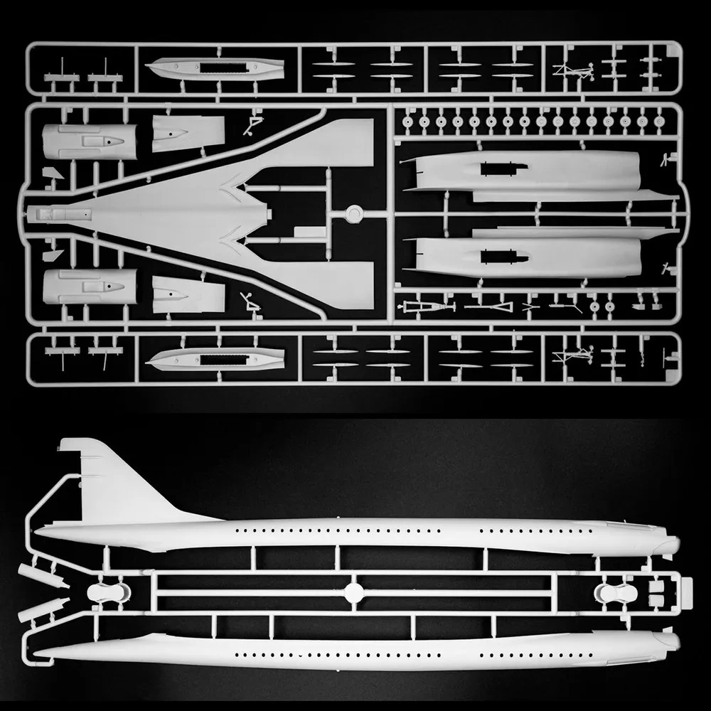 Шестидесятые годы явились периодом бурных обсуждений возможности создания сверхзвукового пассажирского лайнера, который смог бы преодолевать расстояния в шесть-восемь тысяч километров. При этом его скорость должна была достигать до трех тысяч километров в час. Так, между Великобританией и Францией родился проект Согласия, то есть совместной разработки пассажирского самолета Конкорд. А в СССР в конструкторском бюро Туполева был создан Ту 144. Вместе с Конкордом они стали первыми пассажирскими авиалайнерами, способными преодолевать звуковой барьер . На выставке в Париже в 1965 году были показаны оба этих самолета. Они оказались очень похожими друг на друга. Конструкторы из Советского союза сказали, что ничего удивительного в этом факте нет – ведь самолеты создавались согласно законам аэродинамики. Эта сборная модель станет одним из самых интересных экземпляров в коллекции любого любителя сборки пластмассовых моделей. Длина модели 465 мм, размах крыльев 200 мм, 108 деталей. Внимание! Клей и краски в ком